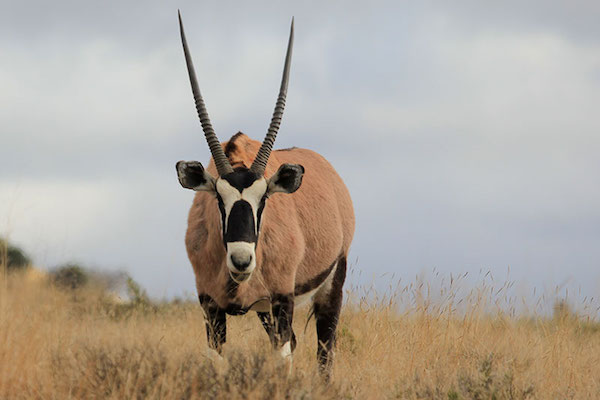The gemsbok or gemsbuck (Oryx gazella) is a large antelope in the Oryx genus. It is native to the arid regions of Southern Africa, such as the Kalahari Desert. Some authorities formerly included the East African oryx as a subspecies. The gemsbok is depicted on the coat of arms of Namibia, where the current population of the species is estimated at 373,000 individuals. The name "gemsbok" in English is derived from Afrikaans gemsbok, which itself is derived from the Dutch name of the male chamois, gemsbok. Although some superficial similarities in appearance (especially in the facial pattern) are noticed, the chamois and the oryx are not closely related.